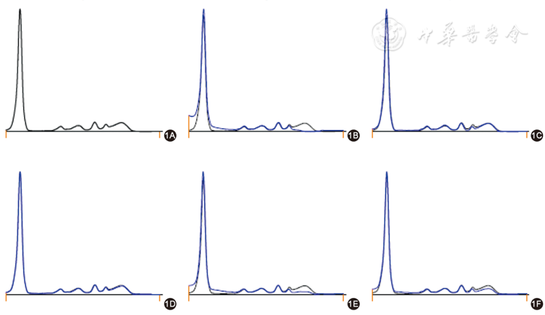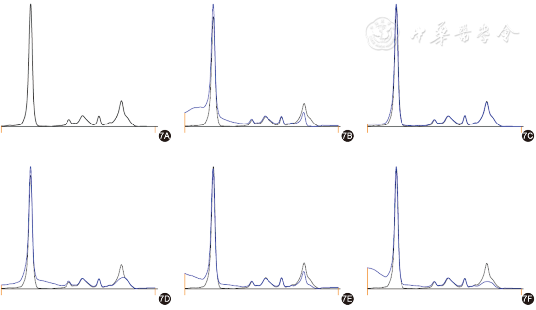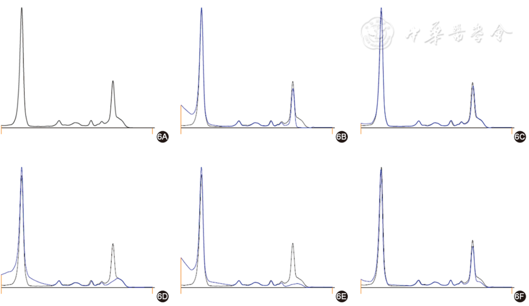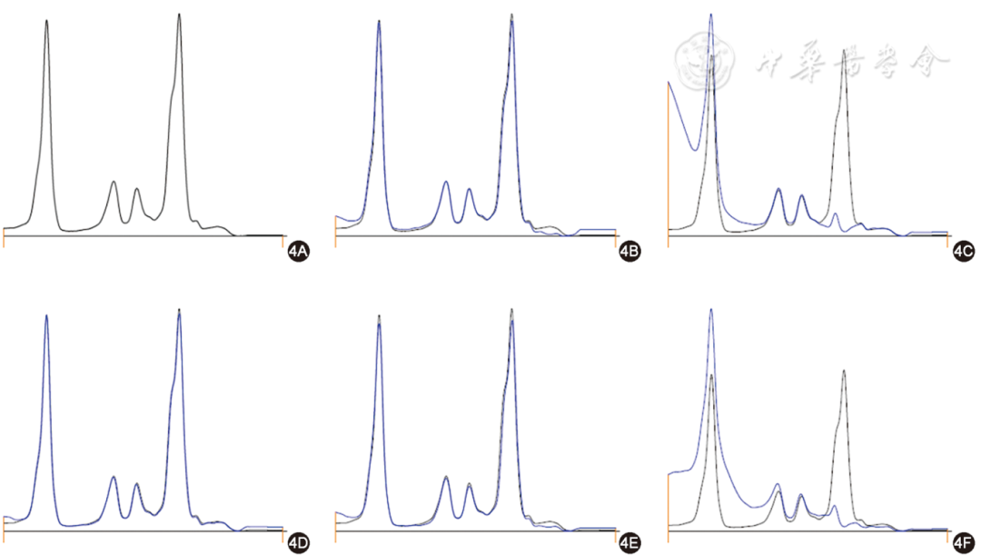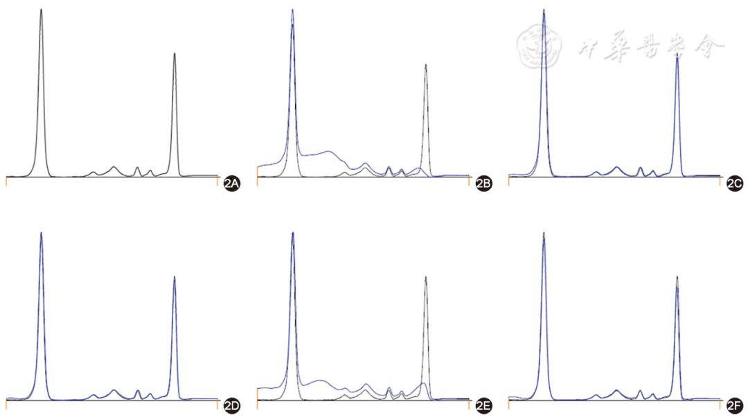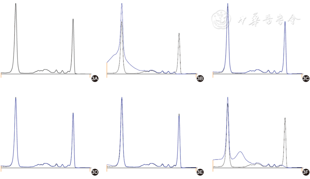 图1 单克隆免疫球蛋白阴性毛细管电泳免疫分型图(1A为血清蛋白电泳图;1B~1F分别为血清与 IgG、IgA、IgM 的重链、总轻链κ、总轻链λ抗体结合后的电泳图;黑色曲线为未加入抗体前待检血清的电泳图,蓝色曲线为加入抗体后的电泳图。与未加入抗体前的电泳图比较,各泳道的消减为成比例消减,未见单克隆免疫球蛋白)