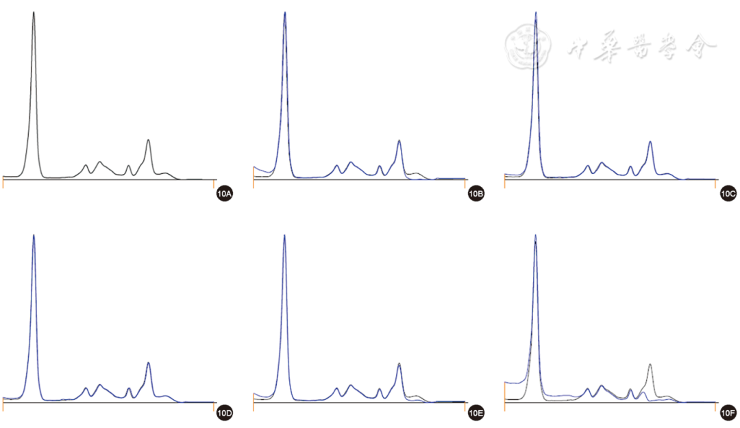 图10 疑似IgD或IgE型或游离轻链λ型的毛细管电泳免疫分型图(10A为血清蛋白电泳图;10B~10F分别为血清与 IgG、IgA、IgM 的重链、总轻链κ、总轻链λ抗体结合后的电泳图;黑色曲线为未加入抗体前待检血清的电泳图,蓝色曲线为加入抗体后的电泳图。与未加入抗体前的电泳图比较,仅见λ泳道发生消减,在重链泳道中及κ泳道中没有消减,则认为存在IgD或IgE型或游离轻链λ型的单克隆免疫球蛋白组分)