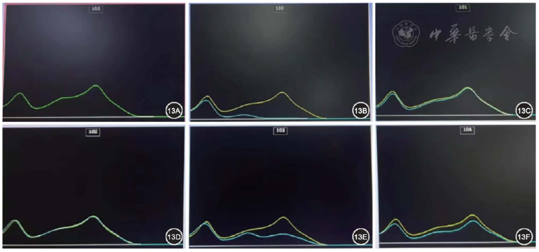 图13 达雷妥尤单抗毛细管电泳免疫分型图(局部放大图,患者在使用达雷妥尤单抗药物治疗后的毛细管电泳免疫分型结果。13A为血清蛋白电泳图;13B~13F分别为血清与 IgG、IgA、IgM 的重链、总轻链κ、总轻链λ抗体结合后的电泳图;黄色曲线为未加入抗体前待检血清的电泳图,蓝色曲线为加入抗体后的电泳图)