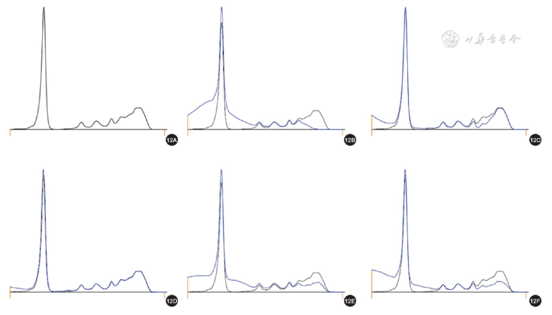 图12 寡克隆型毛细管电泳免疫分型图(12A为血清蛋白电泳图;12B~12F分别为血清与 IgG、IgA、IgM 的重链、总轻链κ、总轻链λ抗体结合后的电泳图;黑色曲线为未加入抗体前待检血清的电泳图,蓝色曲线为加入抗体后的电泳图。与未加入抗体前的电泳图比较,κ和λ泳道上呈现多个微量单克隆峰的消减,则判读为寡克隆型)