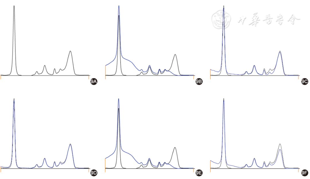 图9 IgGκ型毛细管电泳免疫分型图(9A为血清蛋白电泳图;9B~9F分别为血清与 IgG、IgA、IgM 的重链、总轻链κ、总轻链λ抗体结合后的电泳图;黑色曲线为未加入抗体前待检血清的电泳图,蓝色曲线为加入抗体后的电泳图。与未加入抗体前的电泳图比较,轻链限制性表达,则认为存在IgGκ型的单克隆免疫球蛋白组分)