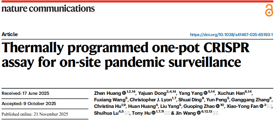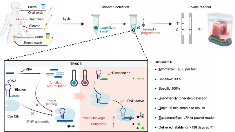 近日,中美多家高校、医院及企业机构合作在杂志Nature communications上发表了一篇题为“Thermally programmed one-pot CRISPR assay for on-site pandemic surveillance”的文章。作者介绍了一种热调控CRISPR增强(TRACE)检测法,能于单管中快速、灵敏地检测多个DNA目标。TRACE的检测限为2.5拷贝/测试,比传统的单管CRISPR检测法低40倍。应用于临床样本时,其在各种样本类型中的准确率高达 99.5%,能在十多分钟内检测出猴痘病毒。此外,TRACE 还能同时检测病原体和宿主基因,解决了当前CRISPR检测法缺乏内部对照的关键缺陷。因此,TRACE能够实现快速现场监测,促进CRISPR诊断从实验室到临床的转化。