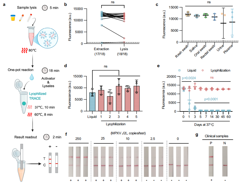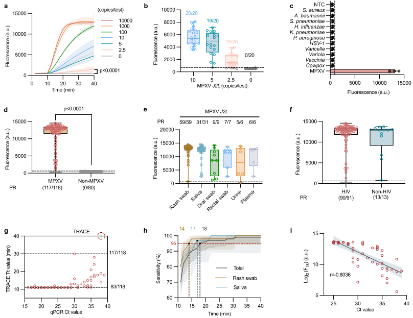 在临床样本验证中,TRACE对118个qPCR阳性和80个阴性样本的结果显示,其灵敏度和特异性均为99%和100%,阳性预测值和阴性预测值分别为100%和 99%,且不受样本类型(如皮疹、唾液)或患者HIV感染状态的影响(下图 d-e)。进一步分析显示,18分钟的TRACE流程(37°C 10分钟和60°C 8分钟)即可准确识别阳性样本,且检测到的信号与qPCR结果具有显著相关性(下图 i )。