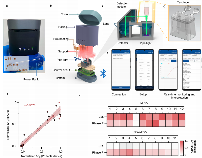 本研究也存在一些局限性。首先,需要进一步的研究冻干TRACE试剂的在实际储存条件下的长期稳定性。未来的研究还应包括来自更多区域的MPXV,以评估TRACE检测方法在具有遗传多样性病毒株上的可靠性。其次,对TRACE检测方法的诊断性能评估还需在大型、独立的群体中进行验证。最后,便携式检测设备采用了简单的荧光检测模块,没有主动冷却系统,这限制了其在实际应用中的处理能力和实用性。