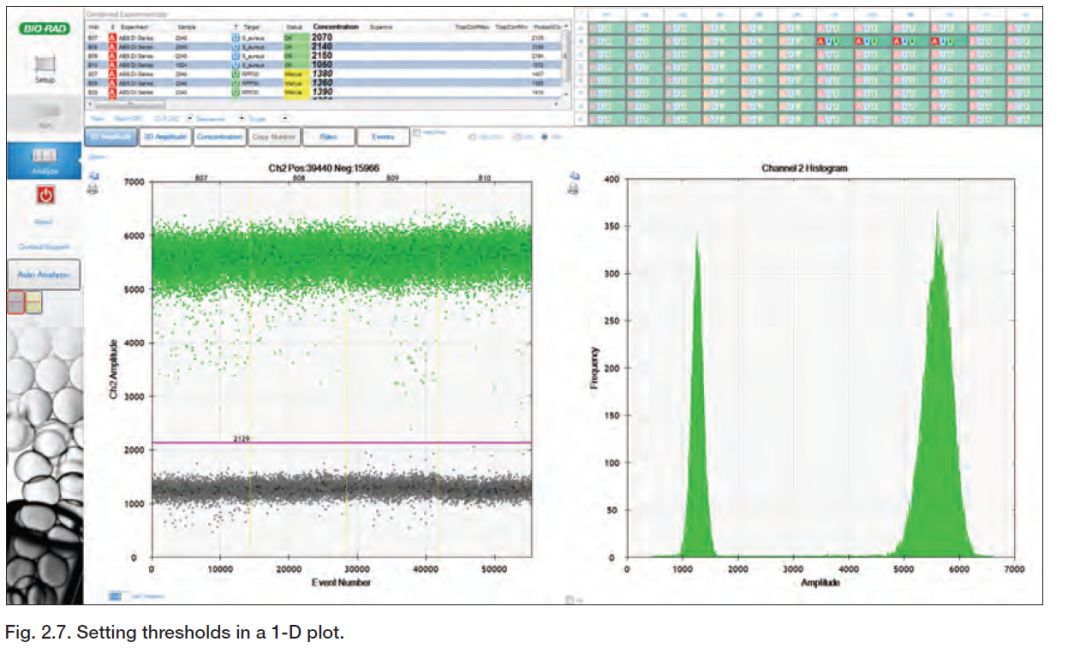 处理数据:调整时,软件会实时更新阳性微滴计数和浓度结果。找到一个您认为能最佳区分信号和背景的位置。
