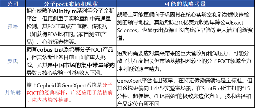 从上表比较容易看出,梅里埃的优势是精耕细作,在微生物这块不断深入挖掘;而其他巨头企业,在庞大的诊断业务版图中有着不同的战略优先级,他们或聚焦于实验室市场,或受制于短期政策冲击,或已在其他POCT领域建立优势。