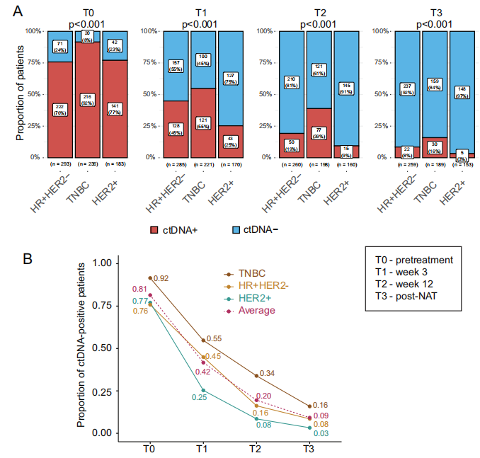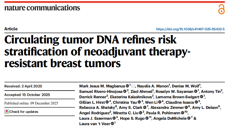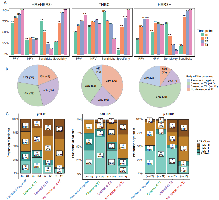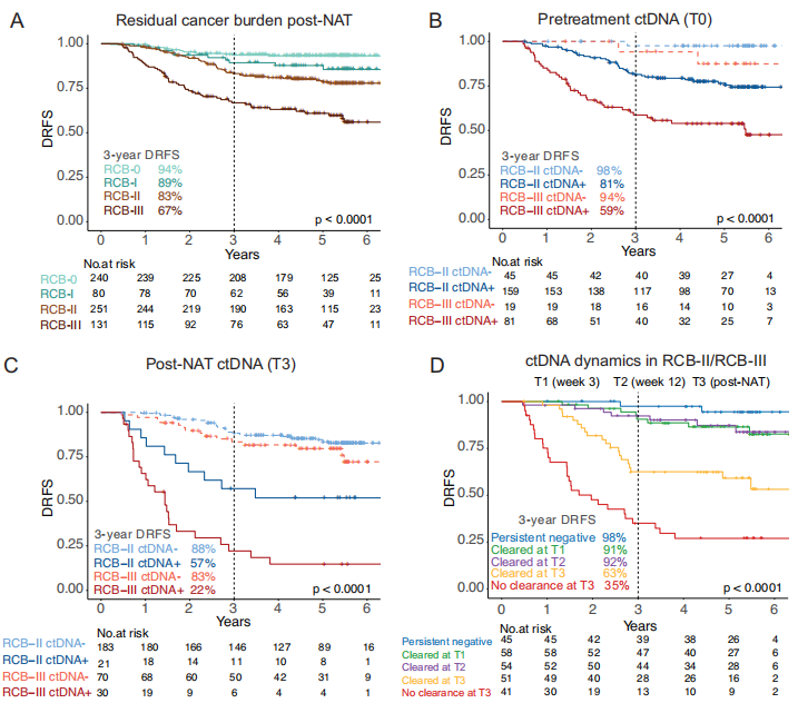 近日,来自UCSF的研究团队在杂志Nature communications上发表了一篇题为“Circulating tumor DNA refines risk stratification of neoadjuvant therapy resistant breast tumors”的文章。研究团队探索了使用循环肿瘤DNA(ctDNA)作为液体活检标志物,优化NAT耐药肿瘤的风险分层,并预测治疗反应。本研究通过大规模临床数据证实,ctDNA动态监测可显著优化NAT耐药乳腺癌的风险分层,早期清除(第3周)作为强预测指标为个体化治疗决策提供关键依据。在 NAT 耐药型肿瘤中,ctDNA 阴性或ctDNA的清除与较低的转移倾向相关。将NAT抵抗型肿瘤的风险分类细化为高转移风险和低转移风险,可以指导治疗决策(降级或升级),以避免过度治疗或克服对NAT的耐药性。 图片来源:Nature communications 主要内容 在NAT治疗前后的阳性率 研究纳入I-SPY2试验中723例高危早期乳腺癌患者,通过肿瘤个体化检测技术,在四个关键时间点对2607份血液样本进行ctDNA分析。结果显示,在NAT治疗前(T0)时,TN亚型的ctDNA阳性率最高(92%)(图A),HR阳性/HER2阴性组和 HER2 阳性组的 ctDNA 阳性率没有显著差异。然而,在开始治疗3周后(T1),HR阳性/HER2阴性亚型的ctDNA阳性率显著高于HER2阳性组(45% VS. 25%)。在12周时(T2)和NAT之后手术前时间点 (T3),HER2阳性组的ctDNA阳性率均保持最低(图B)。 新辅助治疗各时间点的ctDNA阳性率 图片来源:Nature communications 可独立预测转移性复发 作者评估了ctDNA的预后意义,结果显示,治疗前(T0)的 ctDNA 阳性状态是转移性复发的独立预测因素(调整后的风险比=4.40);T3 ctDNA阳性是预后不良的强力指标(调整后风险比=5.20)。作者还评估了ct DNA清除时间的预后意义。结果显示,晚期清除(T3)和未清除均是疾病复发无进展生存期(DRFS)的显著独立不良预后因素(风险比分别达6.88和16.50)。 改善了对NAT耐药肿瘤的风险分层 作者观察到对NAT响应的患者RCB-0或RCB-I可预测良好生存率。RCB-0和RCB-I的患者的3年DRFS率分别为94%和89%(图A)。NAT后的RCB-II/RCB-III患者显著与更差的DRFS相关联,但仅有 17%(RCB-II)和33%(RCB-III)的患者出现转移复发或死亡,RCB-II/RCB-III 在预测DRFS方面的特异性较低。 作者进一步研究了ctDNA状态 是否能改进 NAT 耐药肿瘤患者的风险分层。结果显示,T0 ctDNA阴性的RCB-II组3年DRFS达98%(vs ctDNA阳性组81%),RCB-III组达94%(vs59%)(图B)。T3 ctDNA阴性患者DRFS同样显著改善(RCB-II:88%vs57%;RCB-III:83%vs22%)(图C)。使用ct DNA清除时间进行分析,结果显示,持续阴性(98%)、早期清除(T1:91%;T2:92%) 的RCB-II和RCB-III患者DRFS明显优于晚期清除(63%)和无清除组(35%)(图D)。 ct DNA 改善了对NAT耐药肿瘤的风险分层 图片来源:Nature communications 清除与对NAT的良好反应相关 循环肿瘤DNA(ctDNA)动态变化显示,HER2 阳性组在第3周(T1)时ctDNA清除的比例最大,为57%,而HR阳性/HER2阴性组和TN组的比例分别为32%(图B)。进一步分析显示,T1时的ctDNA清除情况与NAT良好的治疗反应显著相关,早期ctDNA清除的患者中RCB-0/RCB-I的比例最高(HR 阳性/HER2 阴性:42%;TN:82%;HER2 阳性:82%)(图C)。对于不同的治疗方案,早期ctDNA清除同样能预测接受免疫检查点抑制剂(ICI)或HER2靶向药物治疗患者的良好反应。 早期的ct DNA清除与对NAT的良好反应相关 图片来源:Nature communications 与肿瘤突变的关联 作者研究了各时间段ctDNA变异是否保持不变。结果发现,尽管大多数RCB-II/RCB-III患者在NAT后ctDNA检测为阴性,但对其配对肿瘤样本的测序分析发现,肿瘤特异性突变在治疗中和治疗后的残留肿瘤中仍然高度保守(保存率>90%)。作者推测,治疗期间低水平或检测不到的ctDNA分泌以及ctDNA清除可能是具有低转移风险的耐天然抗原疗法肿瘤的特征。 总结与讨论 作者证明了ctDNA的动态变化增强了RCB的预后作用,通过细化对NAT抵抗型肿瘤(RCB-II/RCB-III)的风险分类,支持了ctDNA作为早期生存指标来补充RCB的可能性。从治疗开始后的3周起,ctDNA的清除情况就能够预测对NAT(包括免疫治疗)的反应。在NAT耐药型肿瘤中,ctDNA阴性或ctDNA的清除与较低的转移倾向相关。将NAT耐药型肿瘤的风险分类细化为高转移风险和低转移风险,可以指导治疗决策(降级或升级),以避免过度治疗或克服对NAT的耐药性。 |