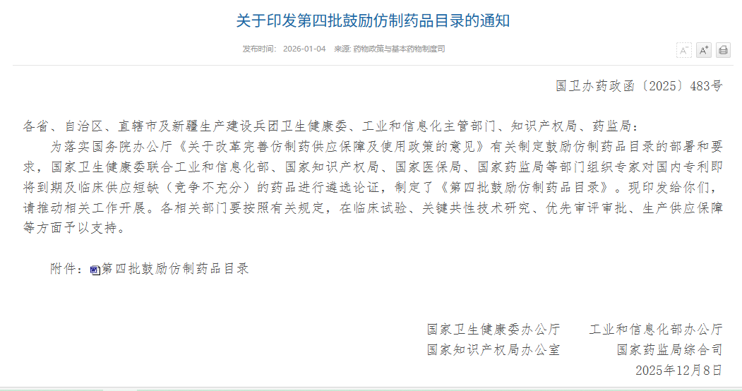 1月4日,国家卫健委等五部门联合发布第四批鼓励仿制药品目录,首次明确将“放射性诊断”用药作为独立领域列入,包括阿尔茨海默病(AD)淀粉样蛋白显像剂氟[18F]贝他吡、神经内分泌肿瘤定位剂镓[68Ga]戈泽肽等四款高端诊断性核药