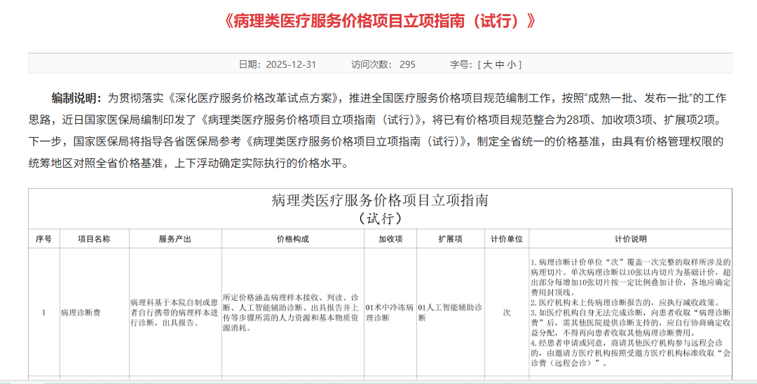 《病理类医疗服务价格项目立项指南》的出台,标志着中国病理诊断行业从依赖人力经验的传统模式,迈向标准化、数字化、智能化的高质量发展阶段。