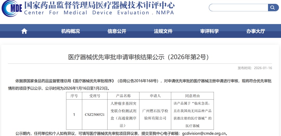 2026年1月16号,依据原国家食品药品监督管理总局《医疗器械优先审批程序》(总局公告2016年168号),广州燃石医学检验所有限公司的“人肿瘤多基因突变联合检测试剂盒(高通量测序法)进入优先通道公示,其同意理由为:该产品属于“临床急需,且在我国尚无同品种产品获准注册的医疗器械”的医疗器械恭喜燃石医学