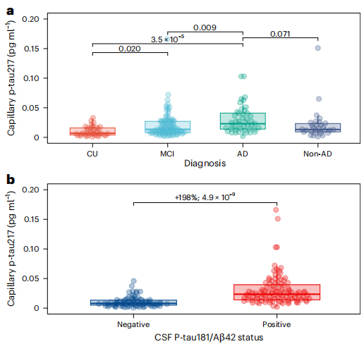 毛细血管中 p-tau217 水平及其与临床诊断的关系。图片来源:Nature Medicine