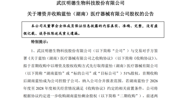 1.3570万元拿下湖南蓝怡51%股权!明德生物一个月内两度并购,能否打开第二增长曲线?,每经网,2026