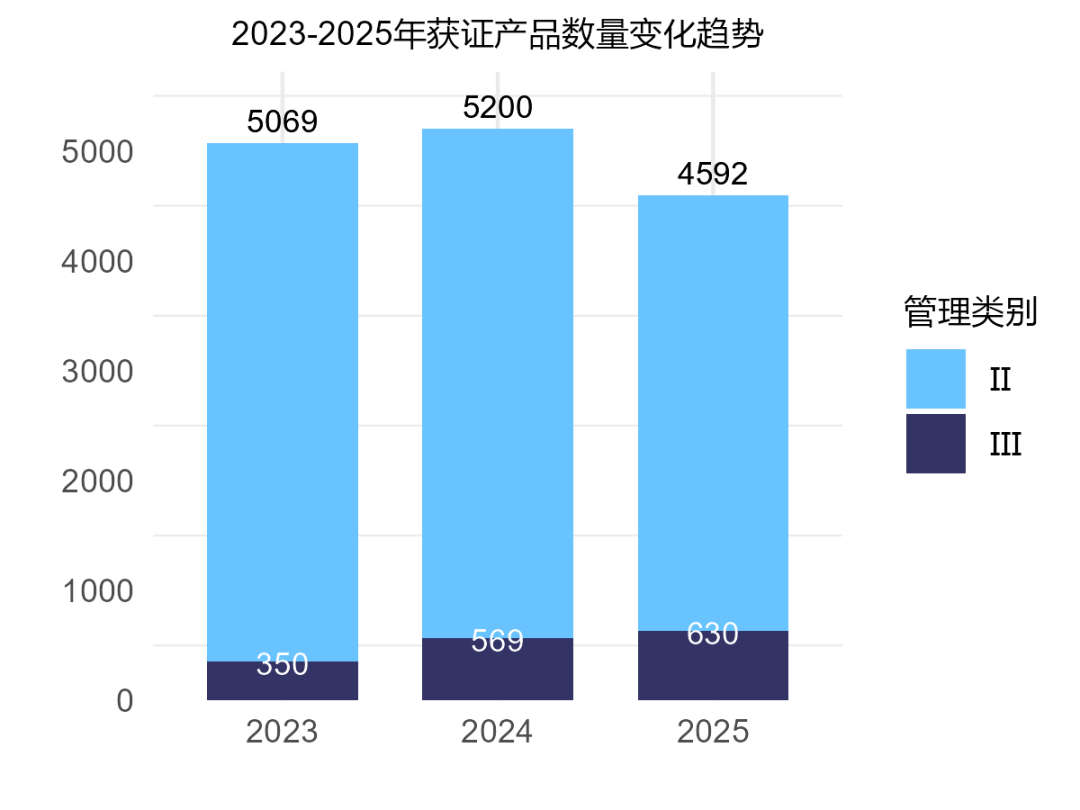 时间趋势看,2025年获批的产品数量与2023和2024年相比显著减少,Ⅲ类产品数量显著增加。(图5)