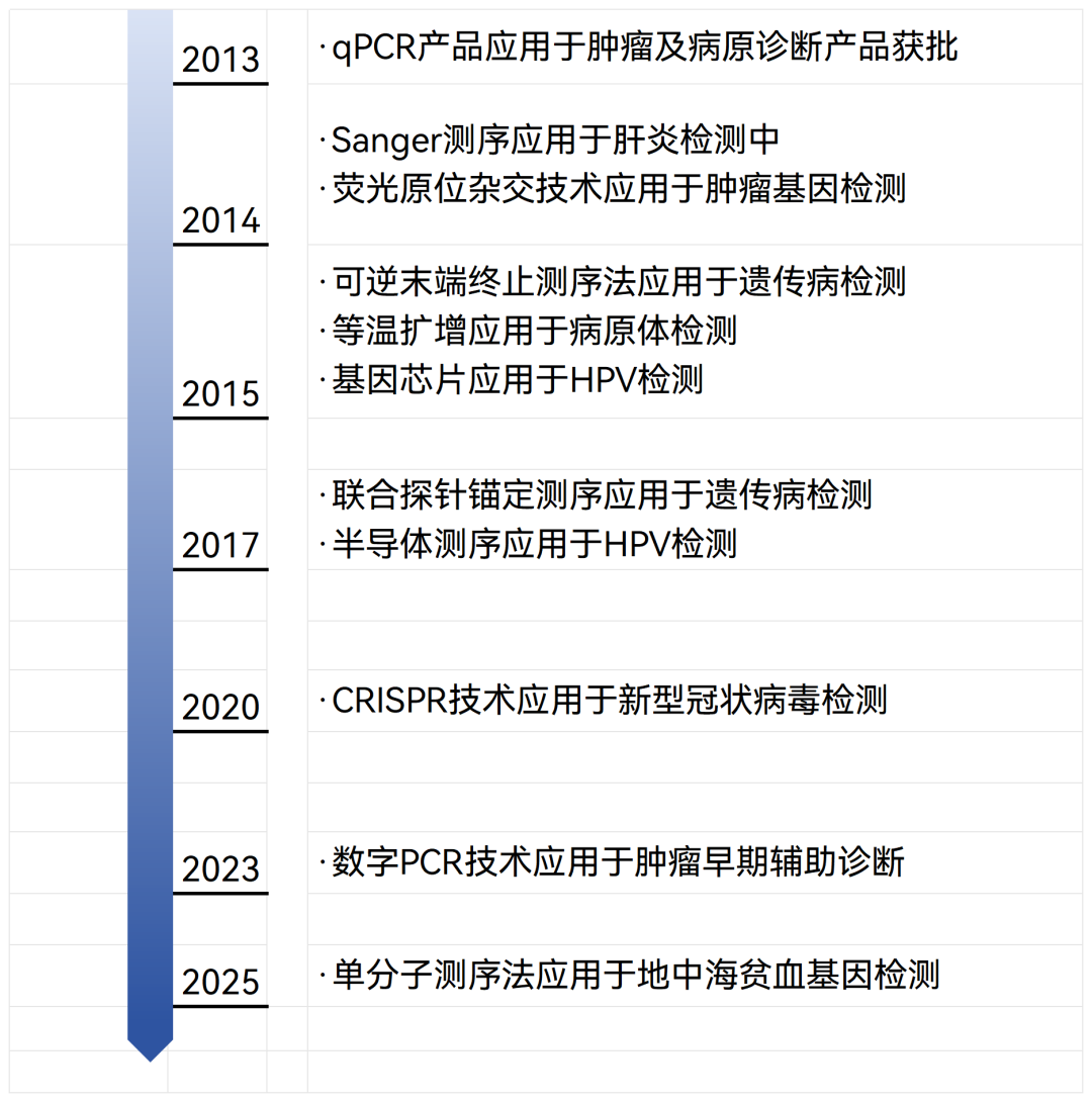 技术演进上,2025年首款基于单分子测序的检测产品获批用于地中海贫血诊断中,标志着三代测序技术在特定领域的技术优势得到监管认可。(图7)