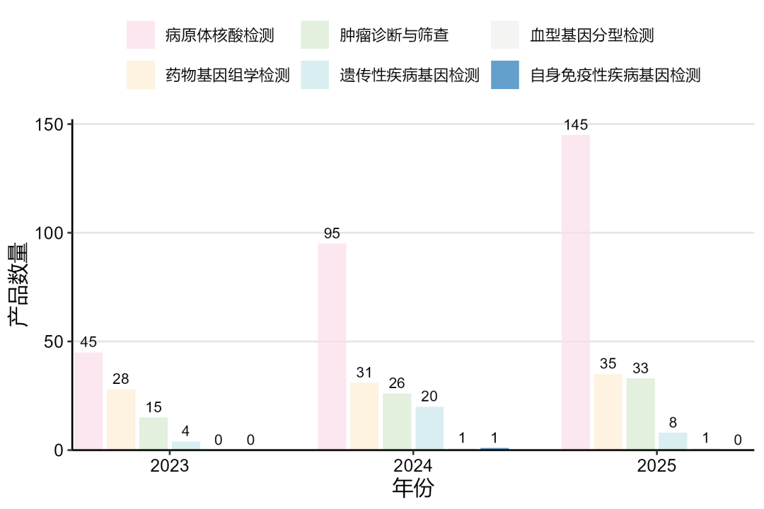 2023—2025年间,病原体核酸检测、药物基因组学检测及肿瘤诊断与筛查三个领域获批的产品数量均呈现上升趋势。以病原体核酸检测领域数量增加最为明显,2023-2025年间单年获批的产品数量较2023年增加100款。(图12)