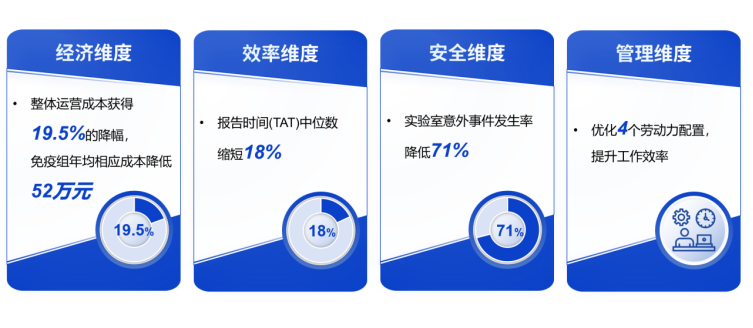 在第十三届东方检验医学学术会议汇报中有提到[6]:免疫自动化流水线的多维价值评估研究构建了涵盖安全、有效、经济与管理四个维度的综合价值评估框架。真实世界数据进一步显示,全实验室自动化系统的价值具有全方位、多维度的特点: