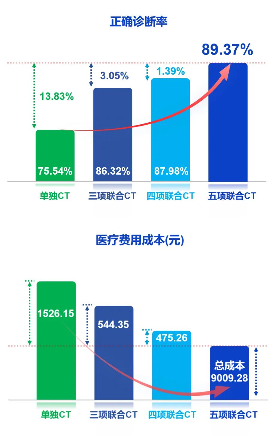 以肺癌诊断为例,研究显示[4],五项血清标志物联合CT检测的诊断正确率达89.37%,较单独CT、三项联合及四项联合分别提升13.82%、3.05%与1.39%。诊断准确性提升直接带来费用节约:五项联合CT较其他三种方式分别节约1,526.15元、544.35元与475.26元。这不仅实现了“诊断更准”,也切实做到了“费用更低”,在提升临床效果的同时减轻了患者负担。类似地,在卵巢癌诊断中,ROMA指数联合超声每获得一个质量调整生命年(QALY)仅需增加成本45,633元,低于我国人均GDP阈值,显示出良好的成本效果[5]