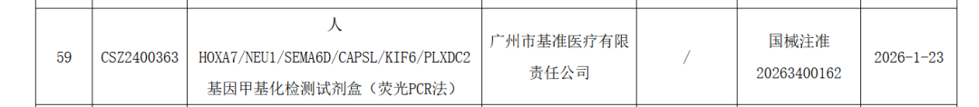 早筛网讯:康圣环球旗下子公司——广州市基准医疗有限责任公司的人HOXA7/NEU1/SEMA6D/CAPSL/KIF6/PLXDC2基因甲基化检测试剂盒(荧光PCR法)(国械注准20263400162)正式获批!