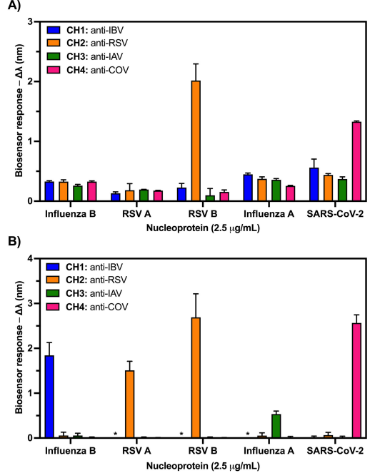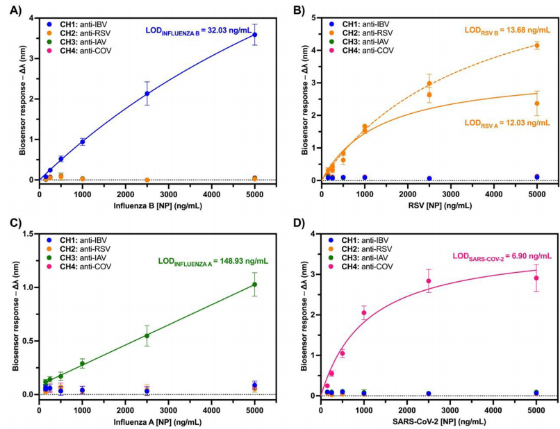 呼吸道病毒感染已成为21世纪的重大健康问题,每年导至数十亿病例,死亡率和经济社会影响不断攀升。不仅有SARS-CoV-2及其变种,季节性高致病性病毒,如甲/乙型流感病毒(IAV/IBV)和呼吸道合胞病毒(RSV)也在秋冬季共同流行,且临床症状(如发热、头痛、喉咙痛、咳嗽)高度重叠,仅凭症状无法区分。为了有效控制传播,指导及时治疗并防止大规模暴发,扩展快速、多重病原体诊断检测的可及性至关重要。 目前,临床诊断主要依赖两类技术,.基于核酸扩增的分子检测如PCR是诊断金标准,具有高灵敏度和特异性,并可实现多重检测。但成本昂贵,且需要专业实验室和操作人员,限制了其POCT的使用。快速抗原检测(RAT)作为POC替代方案,性能处于中等或较低水平,灵敏度波动很大。因此,需要开发一种新的诊断工具,保持高灵敏度和特异性的同时,具备POC检测的快速、简便和低成本特性,并能实现多重检测。 近日,来自西班牙的一组研究团队在杂志npj Biosensing上发表了一篇题为“Disposable Point of Care multiplexed plasmonic biosensor for rapid and specific identification of respiratory viruses”的文章。作者开发了一种基于无标记等离子共振技术的多分析物诊断平台,用于快速识别、区分和定量最常见的呼吸道病毒(SARS-CoV-2、流感 A/B 病毒和呼吸道合胞病毒)在鼻咽拭子中的病毒抗原,能够达到纳克/毫升级别的低检测限。临床验证表明,这种新型诊断平台具有高灵敏度(97.22%)和高特异性(100%),与基于 PCR 的分子检测具有极好的相关性。其准确性和用户友好型设计,此传感器可被定位为一种在医疗现场快速进行多重病毒感染诊断的诊断工具。 图片来源:npj biosensing 主要内容 多重等离子生物传感平台的原理与设计 研究团队开发了一个集成的诊断平台(如下图),集成了卤素灯、光谱仪和电机驱动的线性位移台,这些组件都集成于一个便携箱体中。作者还定制了一款一次性微流控芯片,尺寸为 50 × 28 毫米,专为一次性POCT应用而设计。选择病毒的保守核衣壳蛋白/核蛋白(NP)作为检测目标,等离子传感器芯片四个独立的传感区域(通道CH1-CH4)上分别固定了四种特异性抗体,CH1抗乙型流感病毒(IBV)、CH2抗RSV(A/B型)、CH3抗甲型流感病毒(IAV)、CH4抗SARS-CoV-2。这种蛇形布局允许从单一样本中同时检测、鉴别和量化四种不同的病毒NP。 病毒核蛋白诊断平台的工作流程。图片来源:npj biosensing 多重检测的优化与性能评估 多重检测时,高浓度NP会在非目标通道中出现显著的非特异性结合信号(下图 A),作者通过在运行缓冲液中加入硫酸葡聚糖(DS),有效抑制了非特异性相互作用(图 B)。最终得到的检测限(LOD)分别为,乙型流感核蛋白为 31.43 ng/mL、RSV A 核蛋白为 30.63 ng/mL、RSV B 核蛋白为 19.95 ng/mL、甲型流感核蛋白为 118.18 ng/mL、SARS-CoV-2 核蛋白为 10.60 ng/mL。 在所测浓度范围内,非特异性病毒纳米颗粒未观察到交叉反应。这些结果表明,该生物传感器具备同时有效识别、区分和定量四种不同呼吸道病毒的抗原的能力。 生物传感器的优化和特异性。图片来源:npj biosensing 鼻咽样本中的生物传感器性能 作者还优化了适应临床样本(鼻咽拭子)的前处理方法,通过将鼻咽拭子样本与裂解缓冲液按1:1稀释、0.22 μm过滤,几乎完全消除了背景信号,大大提高了信噪比。在优化条件下,该多重生物传感器针对五种病毒NP(RSV分A/B型),获得了宽线性范围和纳克/毫升级别的检测限(LOD)(如下图)。在临床样本基质中,对SARS-CoV-2 NP的LOD为6.90 ng/mL,乙流为 32.03 ng/mL、RSV A 为 12.03 ng/mL、RSV B 为 13.68 ng/mL、对甲型流感病毒NP的LOD相对较高,为148.93 ng/mL。 鼻咽样本中的生物传感器性能。图片来源:npj biosensing 一次性微流控芯片的临床验证 作者设计了一款专为POCT应用的一次性微流控芯片,并使用了来自医院患者的46份经RT-PCR明确诊断的鼻咽拭子临床样本(36份阳性,10份阴性)进行验证。 结果显示,与PCR结果相比,该多重等离子生物传感器展现了97.22%的灵敏度和100%的特异性。仅有一个PCR Ct值较高(33.44)病毒载量低的甲型流感阳性样本被判定为阴性。而对于除甲型流感外的其他病毒,即使是在PCR Ct值>33(即病毒载量很低)的样本中,传感器也能准确诊断(如下表)。传感器测得的NP浓度与PCR的Ct值之间存在极强的负线性相关关系,这说明传感器信号能够反映病毒载量的变化,提供了除定性诊断外的定量信息。 作者开发了一种即时检测多重等离子生物传感器,能够同时检测多种病毒靶标。该生物传感器设备能够快速识别、区分和定量鼻咽拭子中的四种最常见病毒病原体(SARS-CoV-2、流感 A 型和 B 型以及 RSV)的病毒抗原。与PCR结果相比,该多重等离子生物传感器展现了97.22%的灵敏度和100%的特异性。仅有一个PCR Ct值较高(33.44)病毒载量低的甲型流感阳性样本被判定为阴性。且传感器测得的NP浓度与PCR的Ct值之间存在极强的负线性相关关系,这说明传感器信号能够反映病毒载量的变化,提供了除定性诊断外的定量信息。 未来需要更大规模的临床研究来全面评估其诊断潜力,并需要在未来的研究中深入探讨此方法与其他病原体的潜在交叉反应性,以及针对不同病毒变异株的检测性能。总的来说,所获得的结果使此生物传感器成为一种准确且可靠的工具,可用于同时、快速和可靠地识别、区分和定量四种主要病毒病原体。独立、一次性使用的生物功能化芯片,还使得这项技术能够潜在应用于多种诊断
