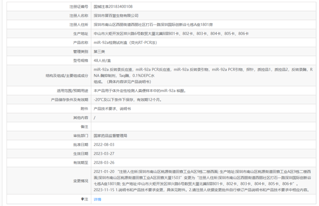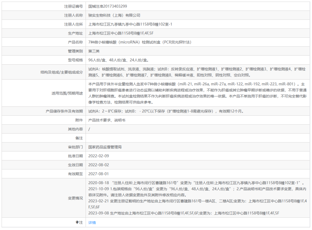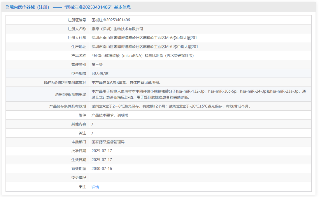 miRNA作为一类长度约18-25nt的非编码RNA,已成为精准诊断的理想分子标志物。miRNA的诊断价值集中体现为“无创性、高灵敏度、高特异性”,可覆盖肿瘤、感染性疾病、神经退行性疾病等多领域,弥补传统诊断手段的短板,实现疾病的早期识别与精准确诊。 miRNA在诊断与分型中的临床应用,依赖于精准的检测技术,目前主流技术包括荧光RT-PCR、数字PCR。其中荧光RT-PCR技术成熟、成本可控,广泛应用于临床常规检测(如晋百慧、命码生物的获证试剂盒)。数字PCR技术灵敏度更高,适用于低丰度miRNA检测(小海龟、新弈等企业)。 本文梳理了截至26年1月,在中国已获NMPA医疗器械注册证的miRNA试剂盒开发企业情况(Ⅲ类为主)。企业名称 | 产品名称 | 注册证号 | 获批时间 | 核心用途 | 技术路线 | 顿慧医疗(原上海骏实生物) | 7种微小核糖核酸检测试剂盒(PCR荧光探针法) | 国械注准20173403299 | 2022-02-09 | 肝细胞癌早诊与疗效监测 | 荧光RT-PCR | 江苏命码生物 | 微小核糖核酸(microRNA - 25)检测试剂盒(荧光PCR法) | 国械注准20153402055 | 2025-03-25 | 胰腺癌辅助诊断 | 荧光RT-PCR | 深圳市晋百慧生物 | miR - 92a检测试剂盒(荧光RT - PCR法) | 国械注准20183400108 | 2022-08-03 | 结直肠癌筛查 | 荧光RT-PCR | 康德(深圳)生物 | 4种微小核糖核酸检测试剂盒(PCR荧光探针法) | 国械注准20253401406 | 2025-07-17 | 疑似胰腺癌患者辅助诊断 | 荧光RT-PCR | 觅瑞(杭州)生物 | 12种微小核糖核酸(microRNA)检测试剂盒(荧光RT-PCR法) | 国械注准20253401959 | 2025-11-12 | 胃癌早筛(国内首个) | 核荧光RT-PCR |