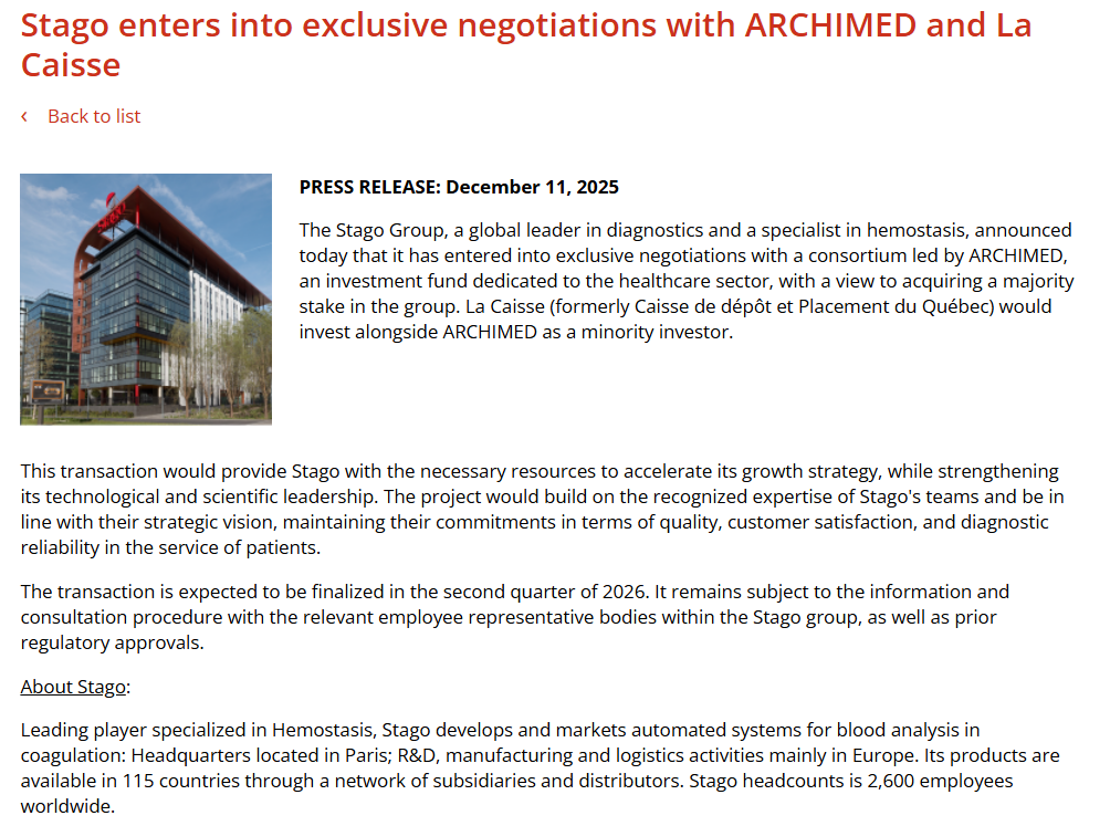 近日,思塔高官网发布消息,公司已与专注于医疗健康领域的投资基金ARCHIMED牵头的财团开启独家谈判,旨在收购Stago集团的多数股权。La Caisse投资集团将作为少数投资方,与ARCHIMED联合参与此次投资。