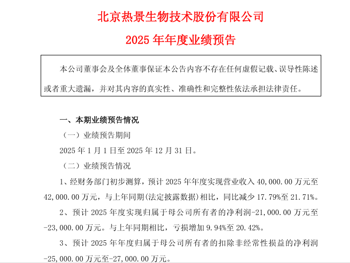 热景生物日前发布2025年度业绩预告,预计全年归母净利润亏损2.1亿元至2.3亿元,扣非后亏损2.5亿元至2.7亿元。这是继2024年亏损1.91亿元后,公司连续第二年出现亏损,亏损幅度同比增加9.94%至20.42%。再看当前的股价,这就是二级资本市场的残酷和无情,价值和价格经常上演大分离。