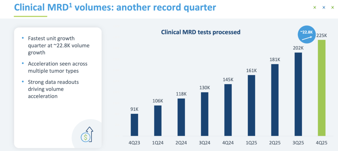 两大梦幻单品,分别有哪些获批难点和看点?” “合规拿证,会开启全新的增长时代”一直没等到国内的检验立项指南发布,所以我们先看看海外。1月29日,Grail宣布其多癌早筛产品Galleri完成了FDA PMA(上市前申请)的提交:另外,最新消息是MCED医保报销的法案已经如我们所预测,获得了总统签字批准,详情如下:4天后的2月2日,Natera宣布其定制化MRD产品Signatera的CDx适应症完成了FDA PMA的提交:一周之内,两个承载肿瘤NGS未来增长梦想的单品,都正式进入了合规拿证的冲刺阶段。PS:这篇仅代表个人观点。如果我俩理解不一样,那么你是对的。欢迎留言区探讨。 PS:视频速览版在文末哦😄 两款产品提交PMA的证据如下:PATHFINDER 2+NHS-Galleri(第一年)+新旧版本的桥接数据其中最核心的数据肯定是P2,用于证明test performance关于P2的详细分析,我们之前写过了,感兴趣的可以去回顾下:提交PMA的证据包更简单,因为它的适应症选的很硬:MIBC(浸润性膀胱癌)术后使用阿替利珠单抗进行辅助治疗的伴随诊断注册临床的研究结果发表在了NEJM上,完成了MRD的三重证明闭环:MRD+,从用药中获益;MRD转阳,从用药中获益;MRD-,无需用药;关于IMVigor 011的详细分析,我们之前也写过了,感兴趣的去回顾:首先,我的观点很明确:这两个产品拿证都是板上钉钉的事情,没有“成或不成”,只有“快或慢”。同时,这个获批也会首次从合规层面给出一个大家都关心的答案:在IMvigor 011中,Natera给出的回答是“1+6+1”——1次基线、每6周做一次监控(持续9个月)、第12个月再做一次监控如果最终真的获批1+7的话,MRD将正式变为“高频复购产品”,商业模式的根基有了质的提升。下面这个让大家流了很久口水的增长就只不过是开胃菜而已了:同时,虽然首张PMA局限于膀胱癌这一细分适应症,但它的核心价值在于打破了FDA对实体瘤MRD技术的监管坚冰。一旦监管路径跑通,后续结直肠癌、肺癌等大癌种的扩项将不再有监管阻碍。上市四年,Galleri总共卖出去了不到48万份,和cologuard这样的季度百万精英相比,绝对是不够看的。我们在之前分析EXAS增长时就提过,一个筛查产品想要放量,有三步:最新消息,美国时间2月3日,川普已经正式签字通过了MCED报销法案2029年生效,起始65岁以下(不含),报销价对标肠癌筛查同时,最终FDA的批准也会回答大家很关注的另一个问题:类似于Pathfinder 2这样的证据,究竟能支撑监管部门批准哪些癌种打包进MCED?这不仅关乎US,也会给全球其他地方的监管机构提供重要的参考。两个承载着肿瘤NGS未来梦想的大单品,终于走到了合规拿证的那一刻。