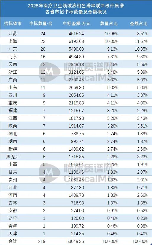 省份层面,采购量前十的省份为江苏、上海、广东、北京、云南、广西、浙江、山东、重庆、四川,合计占全国总量的66.67%。前十省份覆盖三大核心区域,且南方省份占据主导,进一步印证了我国临床质谱市场需求的区域集中度与经济医疗发展水平的强关联性。 医疗卫生领域LC-MS/MS 2025招中标数量前十的省份,临床质谱网制图