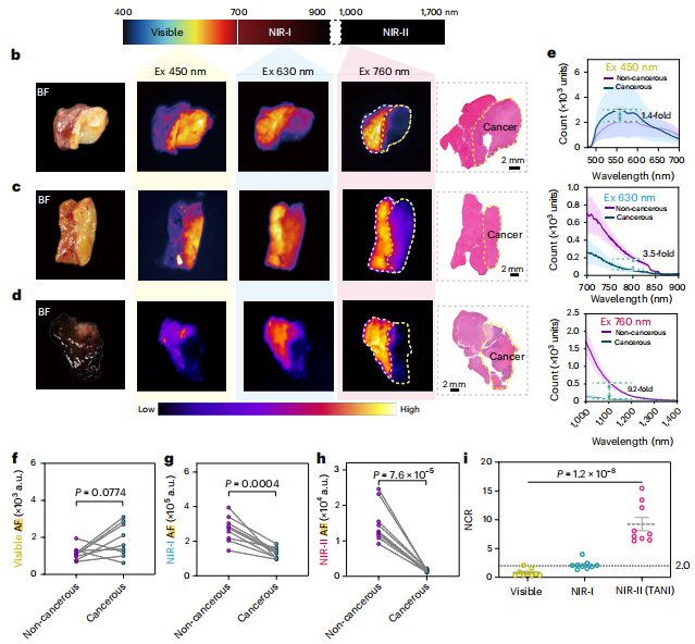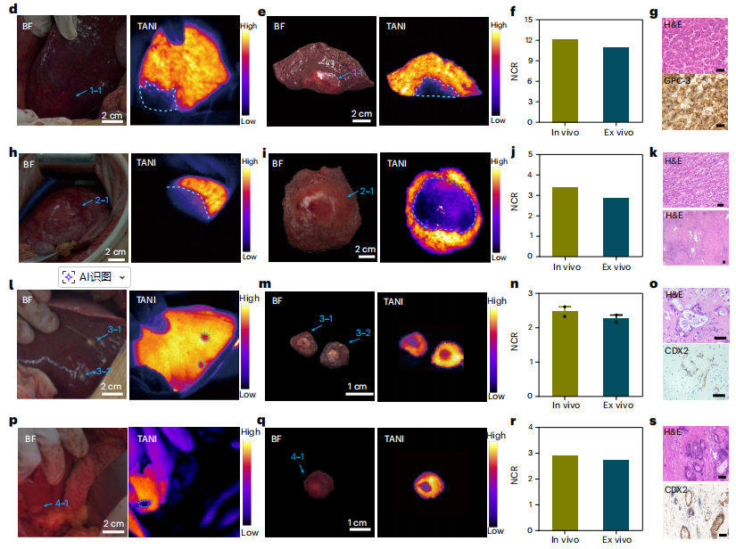 作者评估了TANI在诊断非肝硬化和肝硬化肝脏中的各种肝细胞癌(HCC)方面的普遍适用性。结果显示,肝硬化肝脏组织也表现出强烈的近红外 II 波段荧光强度(NIR-II AF)(图 g),但较非肝硬化肝脏组织略低(图 f),非肝硬化和肝硬化患者的平均 NCR 值分别为 8.56和 5.80(图 h)。