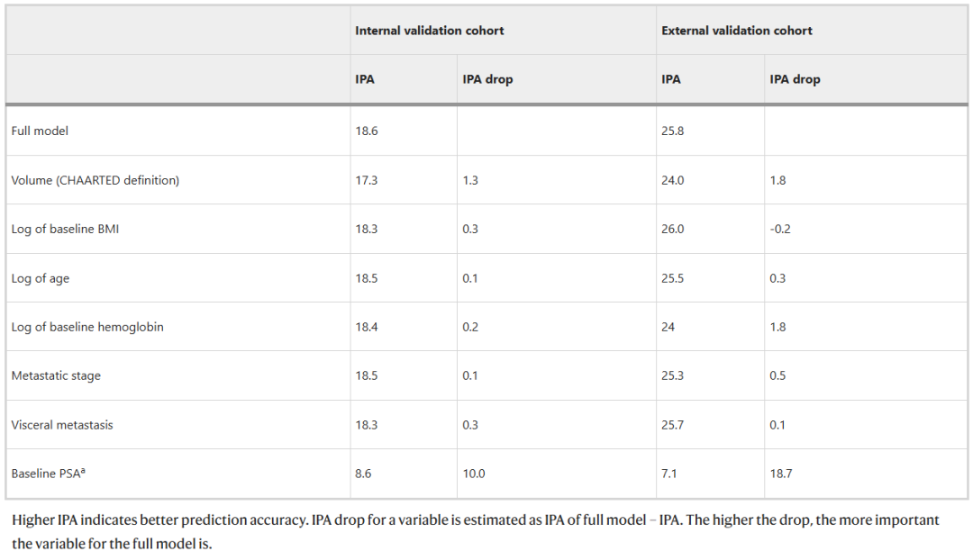 图片来源:Nature Communications 本研究纳入了四项大型、随机、III期临床试验的个体患者数据(IPD),将来自ARASENS、LATITUDE、TITAN的1718名患者划分为训练队列和内部验证队列。作者使用训练队列构建了一个多变量逻辑回归模型(NADIR模型)。纳入模型的预测变量包括基线PSA、基线血红蛋白水平、基线体重指数(BMI)、年龄、转移性疾病负荷、是否存在内脏转移以及转移出现时期。作者还使用内部验证队列以及外部独立ENZAMET队列对模型进行了验证,还进一步分析了模型预测的早期PSA应答概率与患者长期生存结局(OS)之间的关联,同时探索了模型预测的风险与多西他赛疗效之间是否存在相互作用。