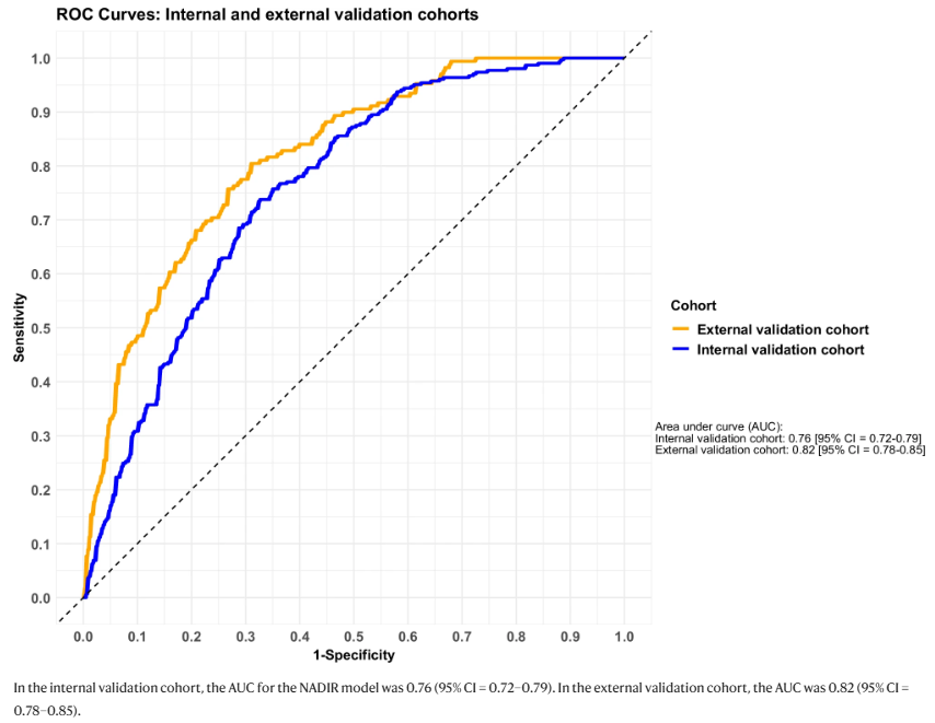 根据验证队列中预测准确度指数(IPA)的损失总结NADIR模型的变量重要性。图片来源:Nature Communications 作者利用训练队列样本构建了NADIR 模型,并应用于两个验证样本组。结果显示,在内部验证样本组中,NADIR 模型的 AUC 为 0.76,Brier 评分值为 0.20。在外部验证样本组中,AUC 为 0.82,Brier 评分值为 0.16(如下图)。在外部验证样本组中,模型的敏感性、特异性、阳性预测值和阴性预测值分别为 0.83、0.62、0.83和 0.62。从多变量模型中去除基线 PSA 会导至外部验证中的预测准确性大幅下降,这证实了 PSA 是一个重要的预测因子,但并非充分的预测因子(如上图)。 内部和外部验证队列中NADIR模型的受试者工作特征曲线。图片来源:Nature Communications 按照模型预测的早期PSA应答概率将患者分为三等分组(上、中、下三分位),在内部验证队列中,达到≤0.2 ng/mL 的有利早期 PSA 反应比例在上部、中部和下部分别为 83%、52%和 32%。在外部验证队列中分别为 92%、74%和 39%。这表明NADIR模型能有效识别出应答可能性极高和极低的患者群体。