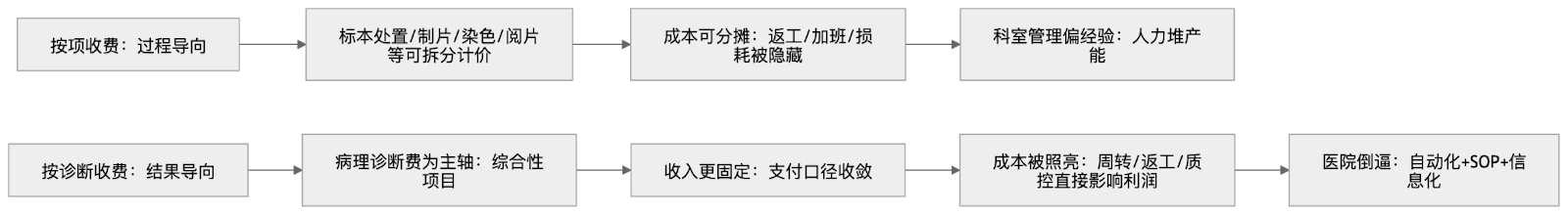 病理的矛盾在于:它是质量敏感型科室,但长期用劳动密集型方式维持产能。过去还能靠拆项收费缓冲:量起不来就多做一步,忙不过来就加班顶上。现在,很多“过程性”项目退出收费体系,医院的直觉反应只有两个: