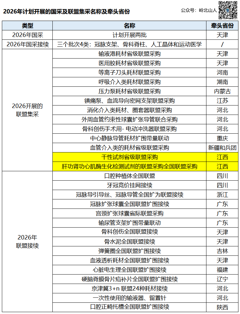 其中江西医保局将牵头新的联盟采购干性试剂省级联盟采购,除此之外,2025年接续的肝功生化和2026年即将到期的肾功心肌酶类生化试剂联盟采购,也成为江西医保局的2026年联盟集采任务。