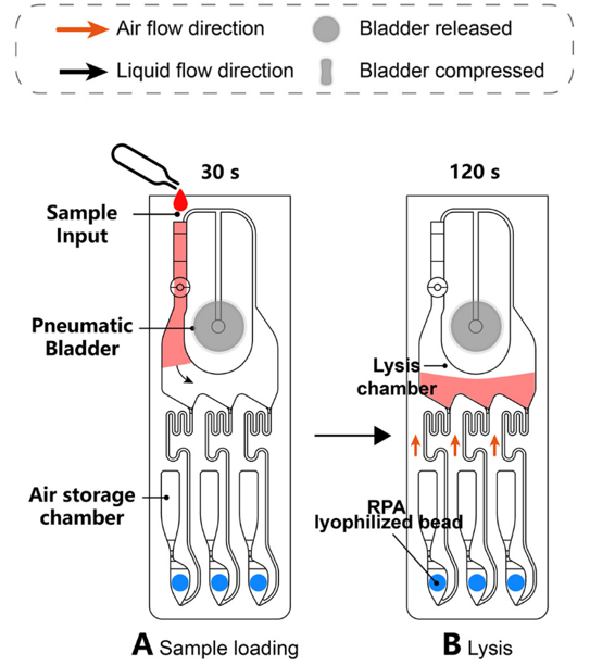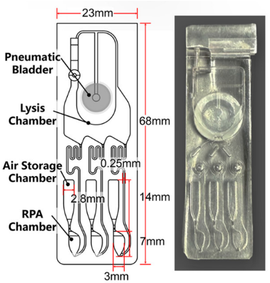 该芯片设计有三个平行通道,其中,每个通道都集成了一个裂解腔、一个 RPA 扩增腔和一个空气储存腔。