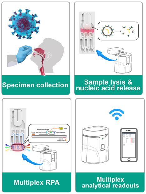 Handheld RPA-based molecular POCT system for rapid, low-cost 8-plexed detection of respiratory pathogens at home.