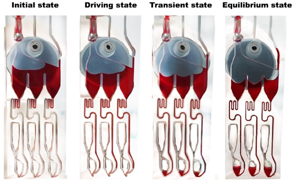 (2) 流体控制模块:该模块配备电机驱动的气囊,可调节芯片内的气压,控制流经通道的流体。片内混合可通过电机多次驱动气囊以压缩和释放腔内空气。