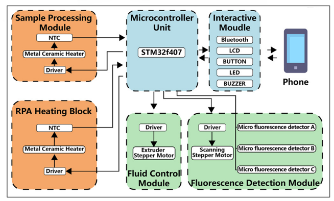 该仪器含有五个部分:1 个微流体芯片和 4 个外部辅助模块,分别用于样品处理、流体控制、RPA 孵育和荧光检测。