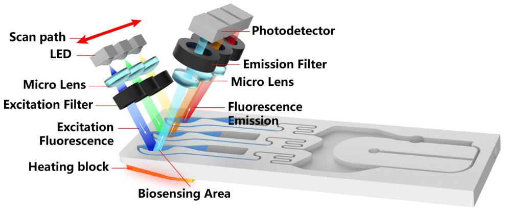 (4) 荧光检测模块 (图 6):该模块采用三通道荧光扫描系统,在核酸扩增过程中同时检测来自三个 RPA 腔体的荧光信号,每个通道配备光电二极管检测器、激发和发射滤光片及 LED 激发光。可见体外诊断常用荧光检测器常见等温扩增产物检测方法