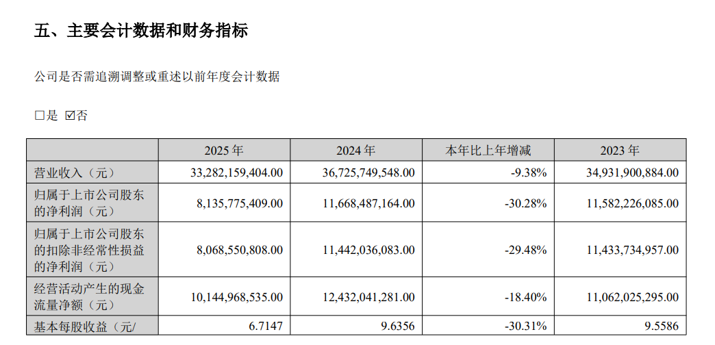 3月30日,迈瑞披露2025年年报。报告期内,公司实现营业收入 3,328,215.94万元,较上年同期下降9.38%;实现净利润845,147.14万元,较上年同期下降28.01%;实现归属于上市公司股东的净利润 813,577.54 万元,较上年同期下降30.28%。