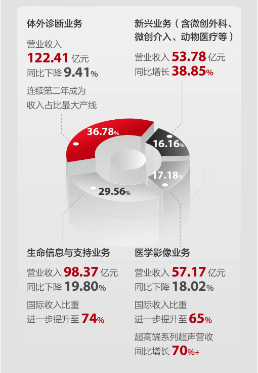 国内市场,报告期内,公司国内业务实现收入1,563,178.42 万元,同比下降22.97%。国内医疗设备行业历经了过去连续三年的深度调整,最困难的时刻已经过去。医院当前和未来一段时间仍广泛面临经营压力带来的整体采购预算缩减,因此近期设备行业仍处于弱复苏阶段。受DRG/DIP 支付方式改革、 试剂集中带量采购、检验结果互认、医疗服务价格治理等多重政策影响,体外诊断行业进入调整收缩期,试剂用量和价格均出现了不同程度的下滑,导至市场规模出现较大幅度萎缩。上述政策的实施虽然带来了短期的行业波动,但有效规范了诊疗行为,提升了医保支付效率,也对医疗机构的诊疗能力提出了更高的要求,这正是公司发挥创新能力、提供价值医疗、抢占市场份额的历史机遇期。因此可以看到,在行业集中度和进口替代率加速提升的趋势下,公司体外诊断业务的市场占有率获得明显增长。报告期内,国内新兴业务也表现出高增长潜力,与体外诊断业务的合计营收占国内业务营收的比例达到近七成,而这些业务将是国内长期快速增长的重要驱动。
