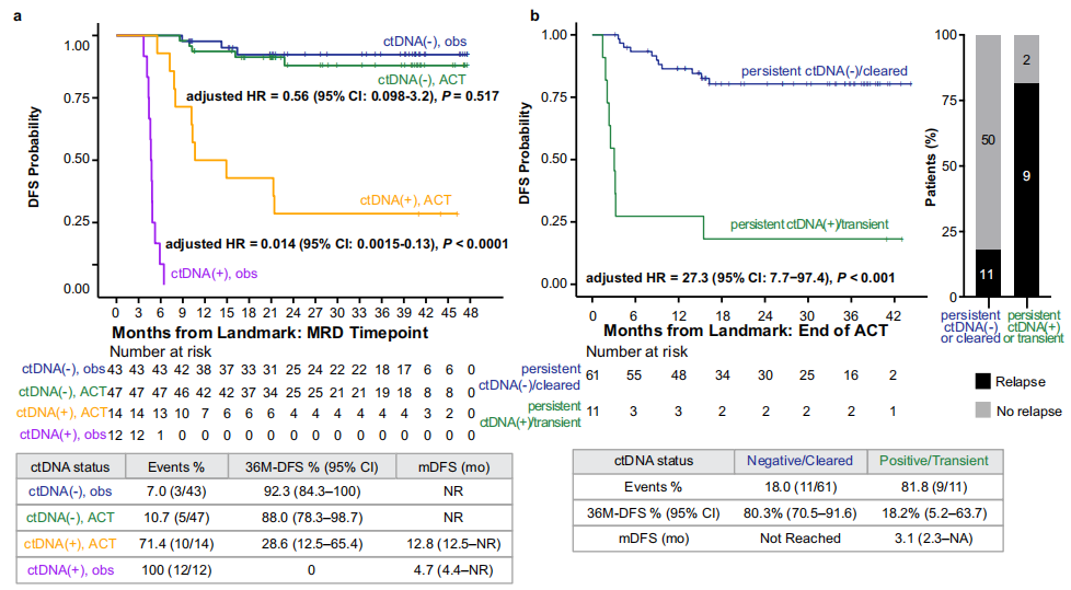 ‌治疗过程中的ctDNA动态变化也具有预后价值。分析发现,在接受辅助化疗期间,ctDNA转阴或持续阴性的患者复发率为18.0%(11/61),远低于ctDNA仍为阳性或出现“暂时转阴”的患者81.8%(9/11)。在接受 ACT 治疗期间的 ctDNA 阳性状态对无病生存率具有高度预后意义(图b),ctDNA 阳性患者的 36 个月无病生存率为 18.2%,而 ctDNA 阴性患者的这一比例为 80.3%。这提示,ctDNA动态监测也能评估治疗效果并预测后续复发风险。