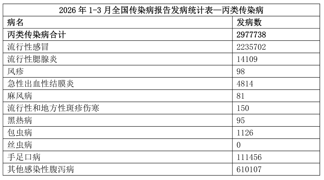 2026 年 1-3 月全国甲乙类传染病共报告发病 836723 例,鼠疫、霍乱、传染性非典型肺炎等多种传染病无病例报告。发病数前 10 的病种如下:梅毒161768例, 肺结核160195例, 乙型肝炎328749例, 新型冠状病毒感染63675例,淋病28252例,布鲁氏菌病12661例,艾滋病10294 例,猩红热5603例,细菌性和阿米巴性痢疾4666例,百日咳2273例。 2026 年 1-3 月全国丙类传染病合计发病 2977738 例,其中流行性感冒发病数最高,达 2235702 例,占比显著;其次为其他感染性腹泻病 610107 例、手足口病 111456 例,为丙类高发传染病。流行性腮腺炎 14109 例,急性出血性结膜炎 4814 例,包虫病 1126 例,其余病种如风疹、黑热病、麻风病发病数均不足 200 例,丝虫病报告数为 0,整体疫情呈集中高发态势,流感、腹泻病为防控重点。 2026 年 1-3 月全国重点监测其他传染病的发病合计发病151576 例。水痘为绝对高发病种,报告 125119 例;其次为肝吸虫病 26334 例,两者为该类疾病的主要构成。低发 / 输入性疾病为发热伴血小板减少综合征、人感染猪链球菌病病例数较少;寨卡病毒病、基孔肯雅热、拉沙热仅为零星个例报告。零发病种:中东呼吸综合征(MERS)、埃博拉出血热报告数为 0,烈性境外传染病无输入流行迹象。 |