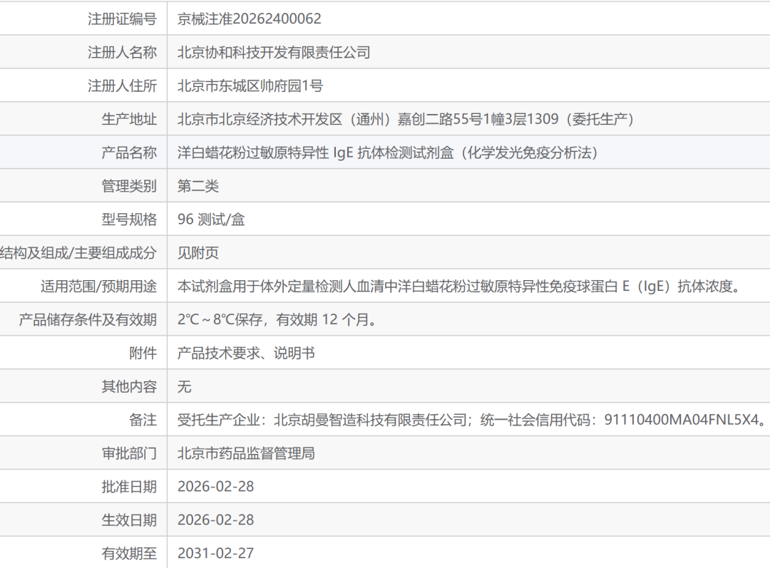 根据北京市药监局2026年2月公告,由北京协和医院自主研发、北京协和科技开发有限责任公司承接转化的**“洋白蜡花粉过敏原特异性IgE抗体检测试剂盒”**,正式获得二类医疗器械注册证(京械注准20262400062)。