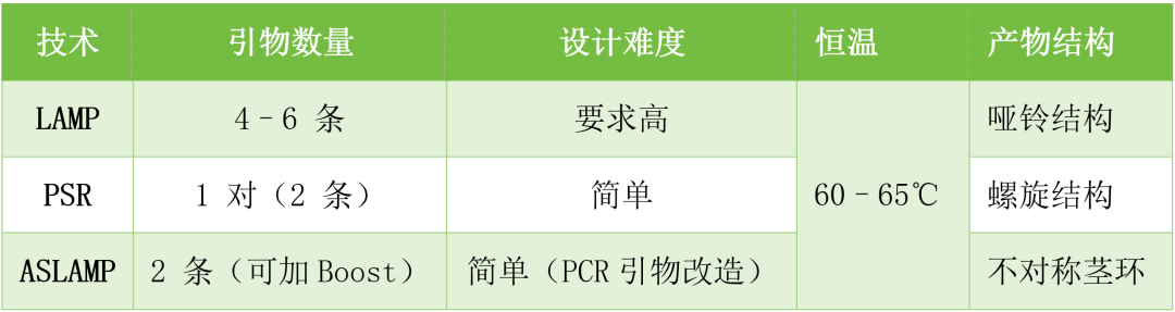 技术本身无优劣,主要看设计者的火候功力,以及技术的应用场景。想最简单,选PSR,想最像LAMP、更稳,选ASLAMP,两者都做到:1对引物、恒温快速、裸眼可读