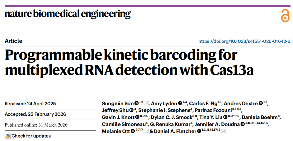 近日,美国‌加州大学伯克利分校领衔的一组研究团队在杂志Nature Biomedical Engineering上发表了一篇题为 “Programmable kinetic barcoding for multiplexed RNA detection with Cas13a”的文章。文章提出了一种新思路,不依靠颜色区分不同靶标,而是利用Cas13a切割反应的动力学差异,把不同RNA靶标编码成不同的“反应速度条形码”。作者将这一策略称为 kinetic barcoding(动力学条形码),并进一步通过对crRNA进行可编程修饰,实现了对Cas13a反应速率的人工调控,最终在液滴体系中完成了多种病毒及SARS-CoV-2变异株的区分。