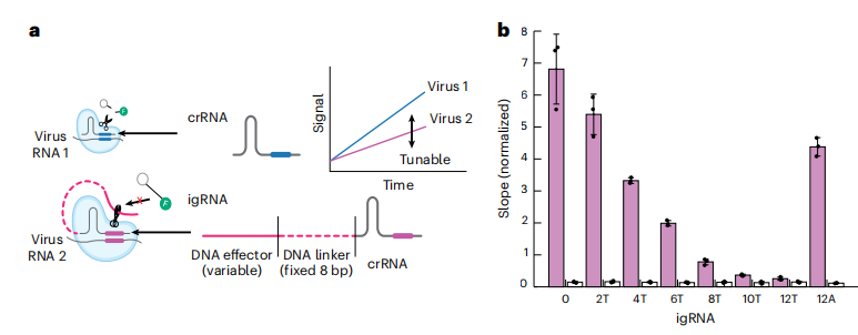 仅依赖天然crRNA的动力学差异不可行,作者发现在crRNA的5'端添加一段单链DNA序列,形成一种杂交引导分子igRNA,会降低报告分子切割速率。DNA越长,且其中胸腺嘧啶(T)越多,Cas13a反应速率下降越明显(图b)。通过在crRNA上加不同长度、不同序列的DNA尾巴,能够在单分子层面上精确调控 Cas13a 的反应速率。