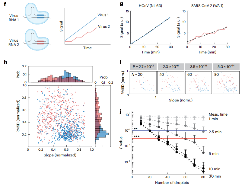 作者先以HCoV-NL63和SARS-CoV-2为例进行了验证(图g)。结果显示,这两类靶标所对应液滴的斜率和RMSD分布能够形成可分离的群体,借助支持向量机分类,单个液滴轨迹可实现约75%的个体区分准确率。多个阳性液滴的信息整合后,识别能力显著增强。分析表明,如果测量了 20 个或更多的阳性轨迹,那么动力学条形码技术能够在 10 分钟内区分 HCoV-NL-63 和 SARS-CoV-2 的靶标(图j)。