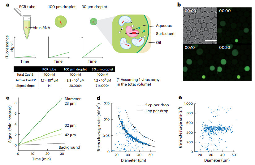 作者构建了一个基于乳化液滴的Cas13a直接检测体系。把含有Cas13a、crRNA、荧光报告分子和靶RNA的反应液打成皮升级别的小液滴,每个液滴中大约只有一个靶RNA分子。液滴内信号是单个靶标激活Cas13a反应的动力学轨迹,而不是平均信号。结果显示,Cas13a信号累积速度随着液滴变小而明显加快,同样是一个靶RNA分子,放在常规PCR管、100 μm液滴和30 μm液滴中,等效“活性酶浓度”以及信号斜率呈数量级提升(图a-d)。