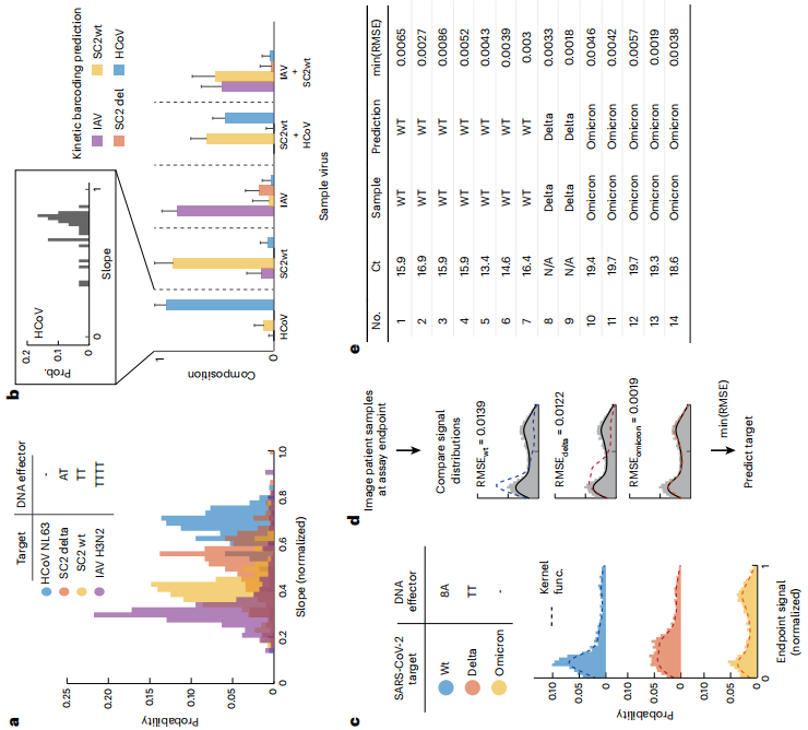 作者选取了4个不同病毒相关靶标,SARS-CoV-2野生型、SARS-CoV-2 delta、HCoV-NL63以及甲型流感H3N2。经过DNA修饰的crRNA使各个靶标在液滴中的斜率分布有显著差异,并且在把所有crRNA混入同一反应后,这些斜率特征仍能基本保持稳定,从而实现多重识别(图a)。