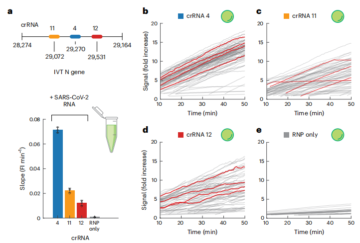 作者设计了多个针对SARS-CoV-2 N基因不同区域的crRNA,并比较了crRNA 4、crRNA 11和crRNA 12的反应速率。结果显示,crRNA 11 和 crRNA 12在大体积反应中的反应速率明显低于 crRNA4(图a)。不仅如此,通过检查信号时间轨迹,作者发现这三种 crRNA 和靶序列导至了不同的动力学行为,单个轨迹的斜率、形状和 x 轴截距差异都很大(图b–e),这说明,不同crRNA的差异不只是终点信号强弱不同,而是体现在斜率、轨迹平滑程度、起始延迟时间等多个层面。
